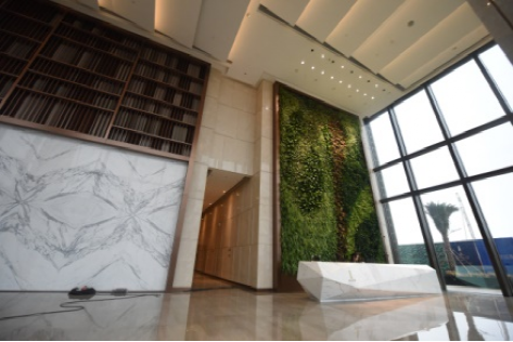 As the first 5A Class A Office Building in Hengqin, Zhuhai, the project requires simple and neat design style with high standard of decoration. Gypsum board ceilings were used in public areas, dry hanging stones were selected for the walls, and natural stone pavements were used for the floors. Aluminum gusset ceilings were selected for the office area, the walls were coated with paint, and the floor used cable elevated floor. The aesthetics of stone patchwork was one of the key points of construction. The interior wall finish of the tower was designed as dry hanging rusty stones. The entire wall surface is assembled from small stone blocks. While ensuring safety and quality, the deepening of the decorative drawings and the layout of stone materials must be performed. Through the joint efforts of all staff, the project achieved the goal that any stone could not go wrong. The lobby wall adopted natural marble mosaic technology, featuring no color difference, aesthetic and elegant. The public area stone walls were firmly installed, and must have straight joints, and the uniform width. The reception desk used ecological green background walls and was full of vitality.