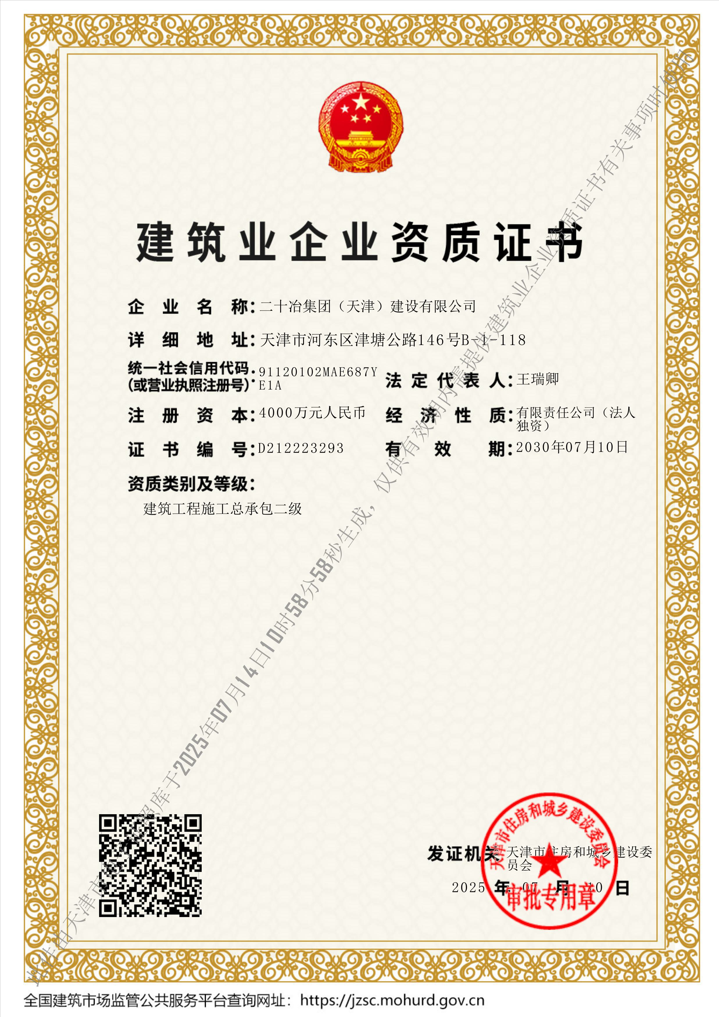 7月10日,天津市住建委核準(zhǔn)通過天津二十冶建筑工程施工總承包二級資質(zhì)申請,企業(yè)成功獲取首項資質(zhì)。