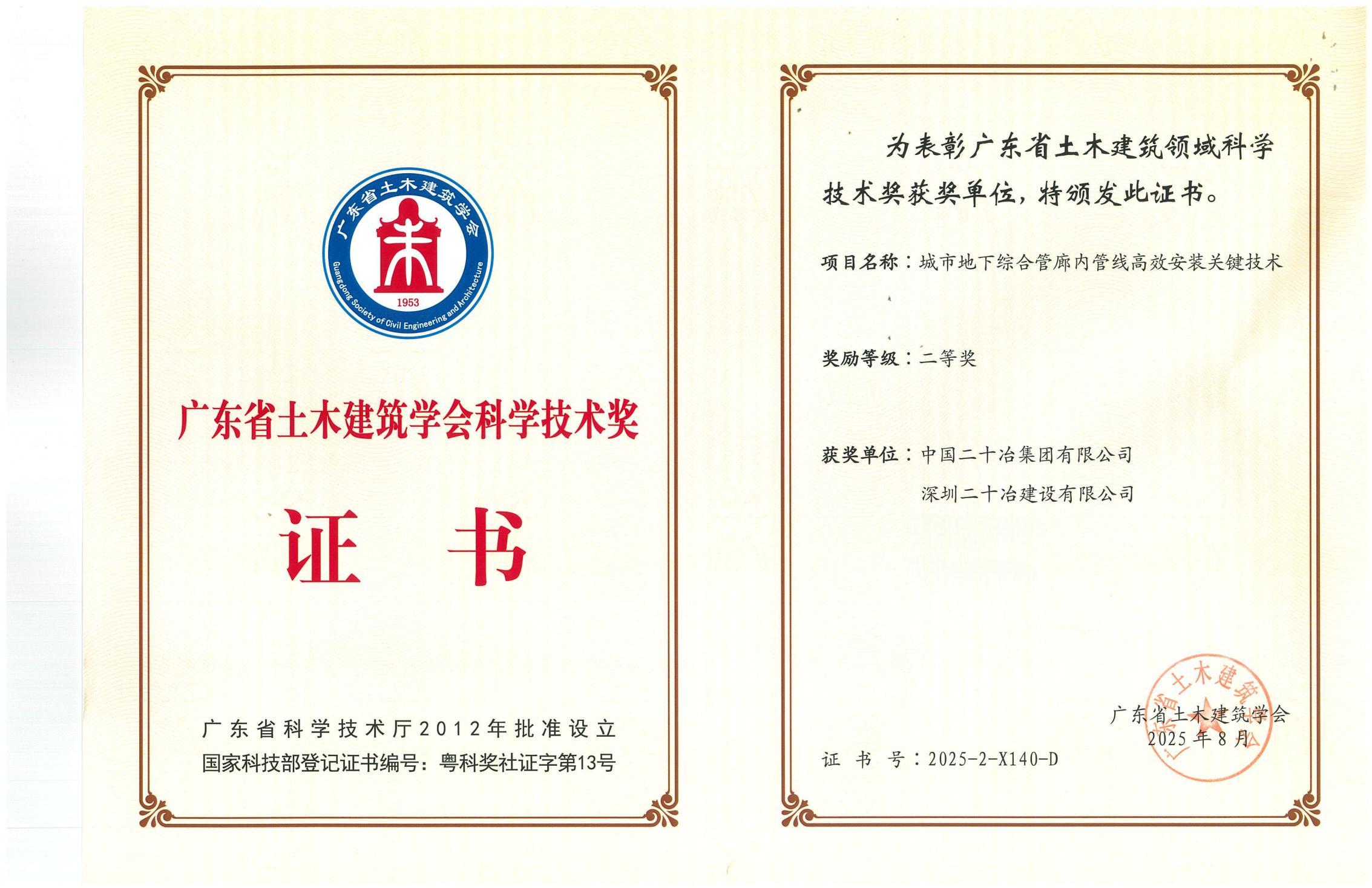 8月22日,廣東省土木建筑學會召開科技創新成果交流會,表彰第十三屆學會科學技術獎獲獎項目,深圳二十冶申報的《城市地下綜合管廊內管線高效安裝關鍵技術》項目榮獲二等獎。