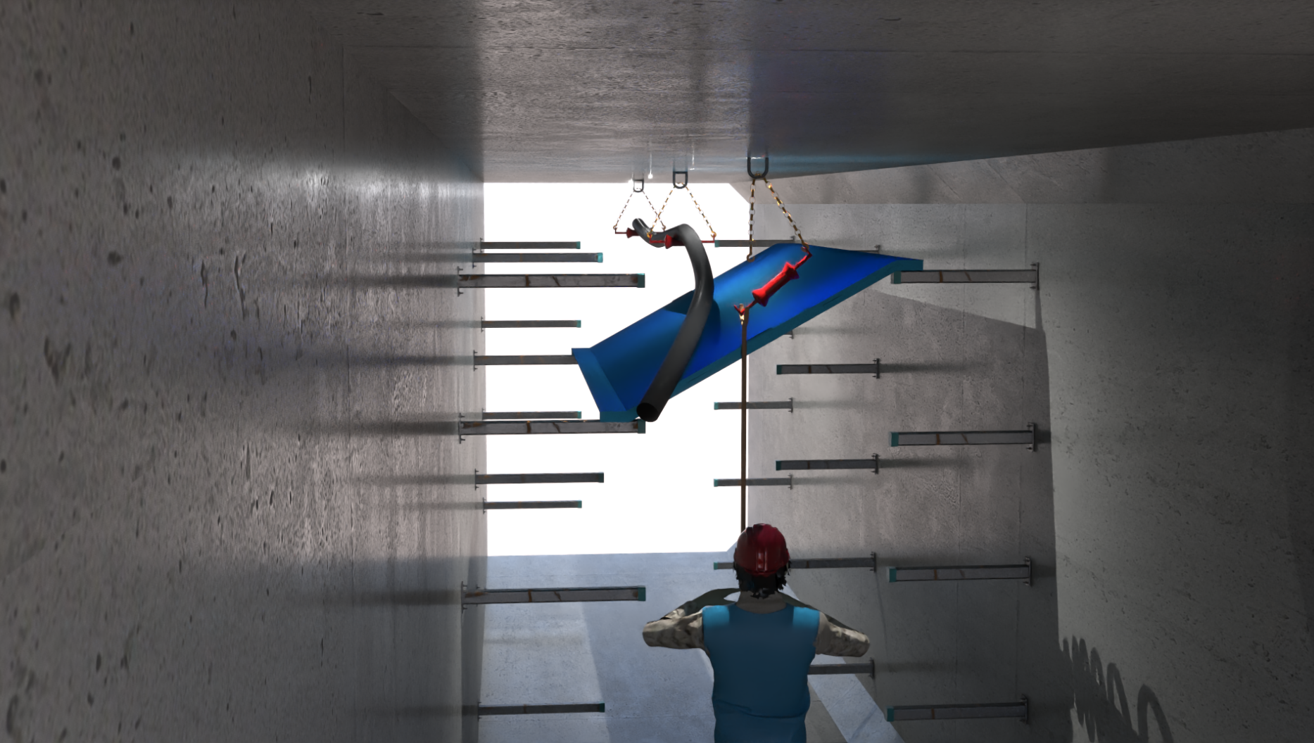 項目包含四項創新技術,其一,BIM 技術應用,通過構建管線仿真模型動態模擬施工全流程,預演管道運輸、吊裝等關鍵工序,優化施工設計,提前解決工序沖突與物料制約問題,減少土建與管線安裝交叉干擾;其二,管線支撐體系安裝技術,研發多功能定位尺、前傾式方案及套管定位等裝置,結合專用運輸輪桿與線纜支架輔助設備,使安裝一次性驗收合格率提高5%,施工速度提升20%,人力成本節約20%;其三,管線高效安裝技術,針對管道、線纜研發裝配化運輸安裝設備,利用移動小車、頂升機構及“懸吊滑輪 + 牽引機”等體系,解決作業空間受限、機械操作難等問題,管道安裝合格率提升4%,施工速度提高40%,人工成本減少35%,推動半機械化轉型;其四,安裝工程安全輔助技術,首創底射照明系統、優化防水設計,開發套管封堵裝置與可調節逃生爬梯,提升防排水能力與安全保障,降低重復施工成本。該項目取得 1 項科技成果(國際先進水平),體現了在技術上的突破,更為后續管廊內的內部設施安裝提供了切實有效的解決方案,對相關工程建設具有重要的參考和推廣價值。
