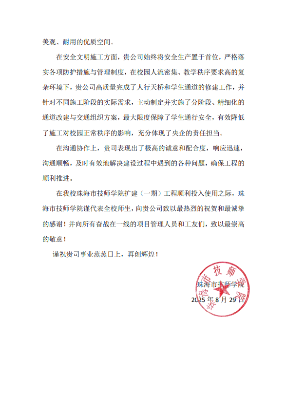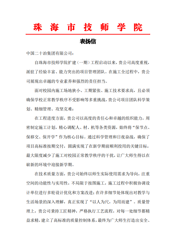 8月29日,廣東二十冶承建的珠海市技師學(xué)院擴建(一期)工程順利完成全部建設(shè)內(nèi)容,以高質(zhì)量標(biāo)準(zhǔn)如期交付。校方第一時間發(fā)來表揚信,對廣東二十冶項目團隊在工程建設(shè)過程中展現(xiàn)出的卓越管理水平、高度責(zé)任擔(dān)當(dāng)及精湛技術(shù)工藝予以高度贊譽和衷心感謝。