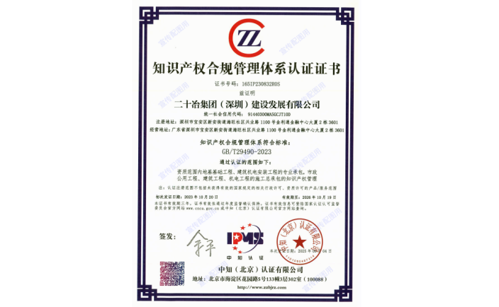 9月7日,二十冶集團(深圳)建設發展有限公司獲得中知(北京)認證有限公司知識產權年度監督審核合格評價。